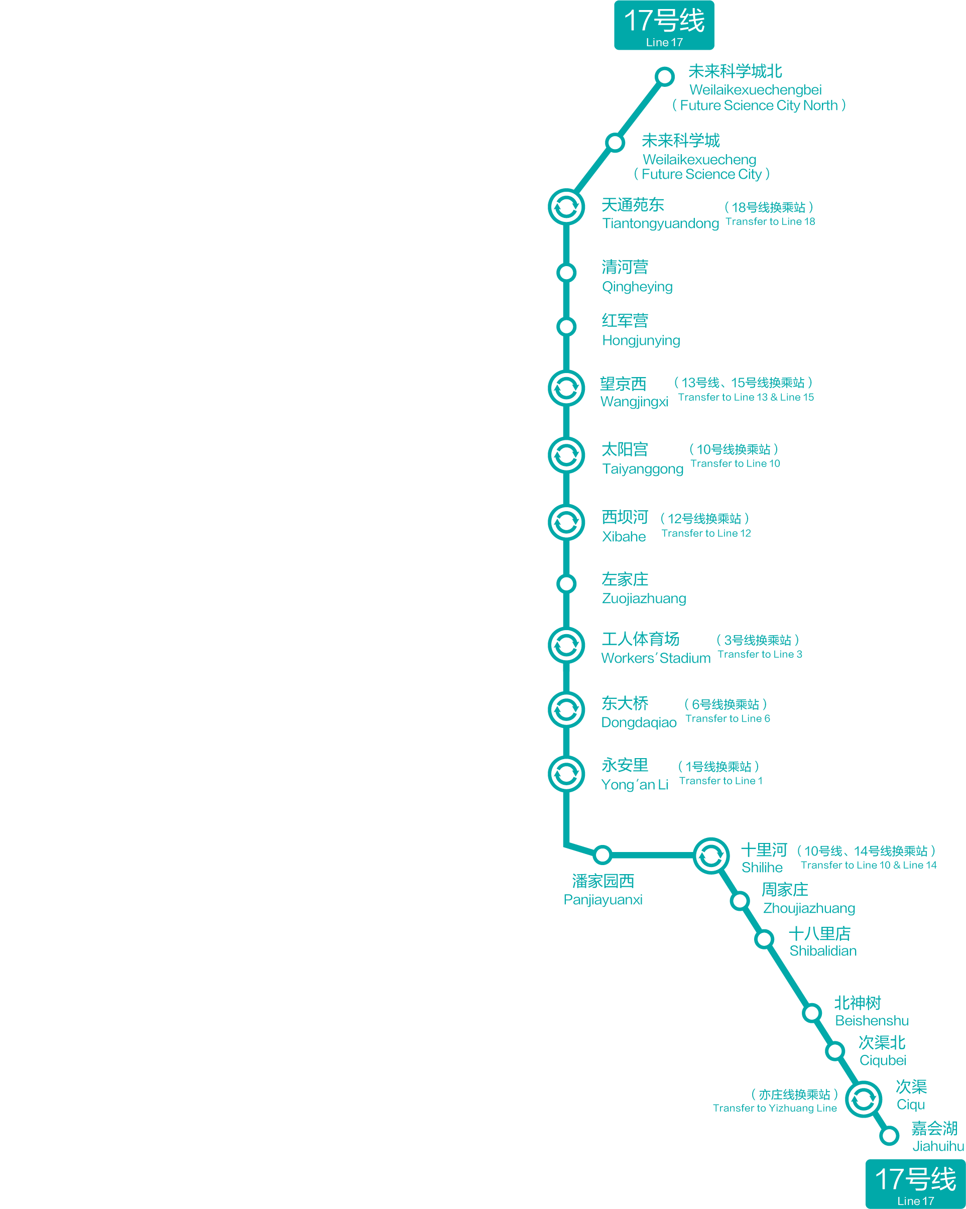 17号线位于北京市东部,是一条南北向大运量等级的快线,南起北京经济技术开发区,北至昌平区未来科学城,跨越通州区、朝阳区、东城区、昌平区4个行政区及北京经济技术开发区,分段开通。17号线全部为地下线,共设21座车站。17号线采用8节编组、A型地铁列车,设计时速100公里。